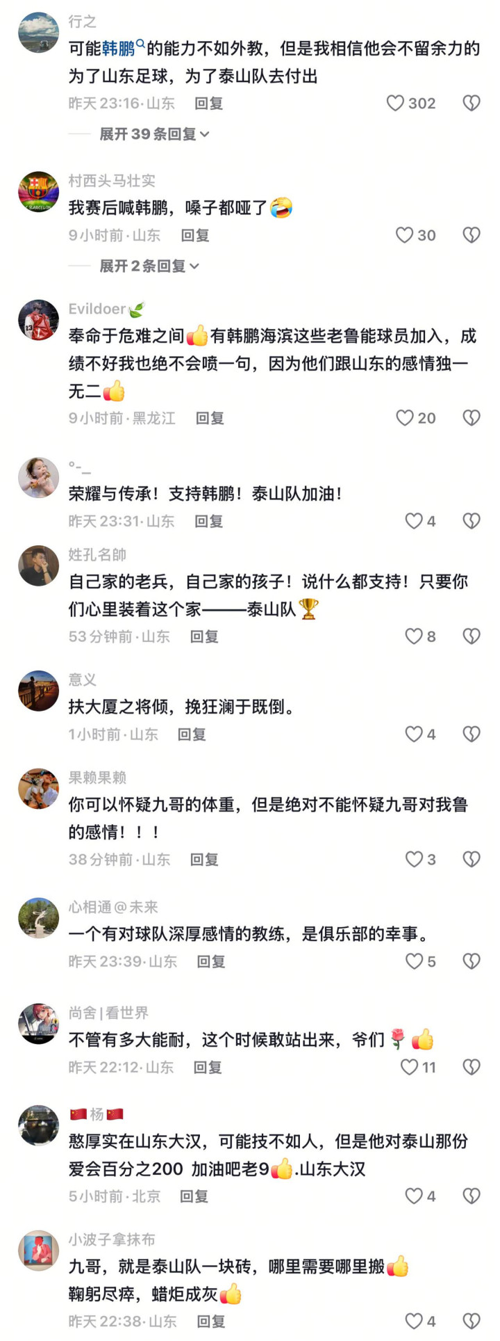 自韩鹏接手一线队以来,泰山球迷的暖心鼓励从未间断。在各大社交平台,“韩鹏加油”的留言持续刷屏。球迷的态度纷纷表示“一个对球队有深厚感情的教练,是俱乐部的幸事。”